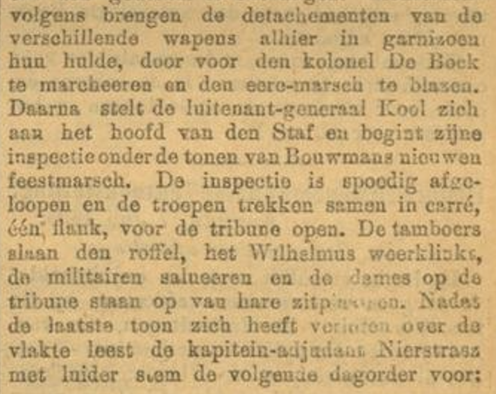 Over de viering van het 70-jarig jubileum van het regiment schrijft het Algemeen Handelsblad van 8 juli 1899: "Daar weerklinkt marschmuziek in de verte: steeds nader komend. Het feestvierende regiment rukt aan ter parade op den weg hartelijk toegejuicht. Kranig komen de troepen het paradeveld binnen." Na alle belangrijke gasten en vertegenwoordigers te hebben benoemd speelt de stafmuziek het Wilhelmus en kan de inspectie plaatsvinden op "Leve het Regiment Grenadiers".